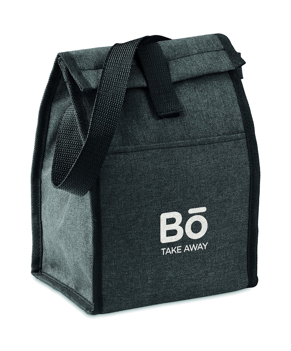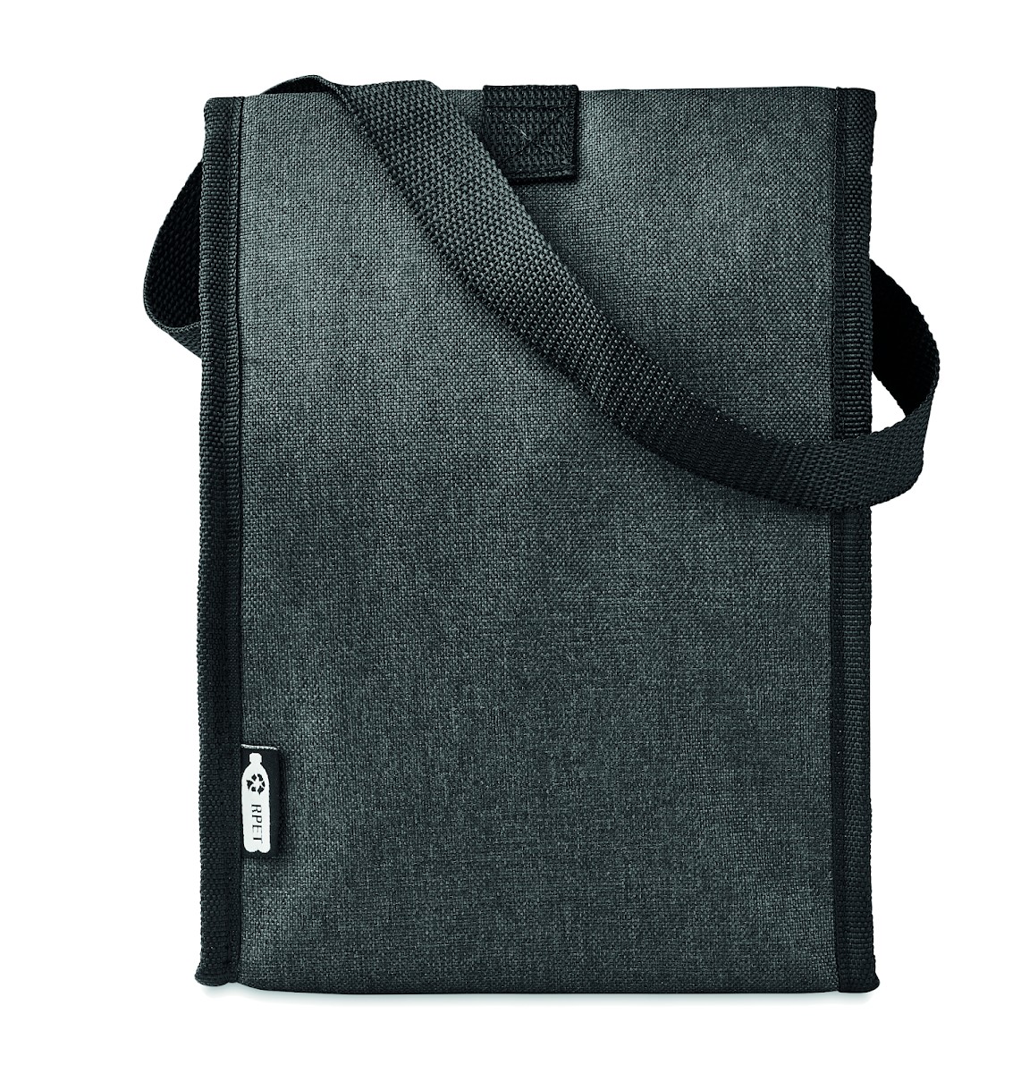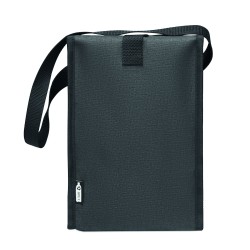 Sac à déjeuner isotherme en RPET 600D avec poche frontale. Capacité 3L. Matériau d'isolation : mousse PE de 2 mm avec feuille d'aluminium.
