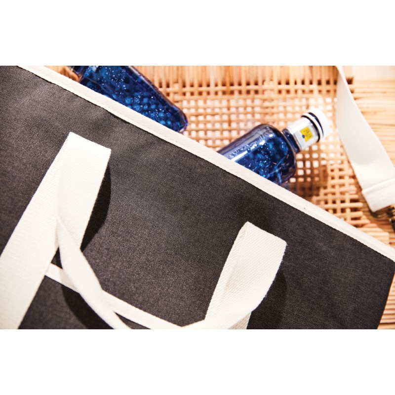 Sac isotherme chiné ton sur ton avec détails en imitation cuir et coton, ce qui lui procure l’élégance d’un sac classique pour pique-niquer avec style. Modèle avec compartiment extérieur plus petit pour ranger d’autres affaires. Le rembourrage épais en PEVA conserve le froid pendant longtemps. Facile à nettoyer à l’intérieur comme à l’extérieur après utilisation. Bandoulière réglable et deux poignées permettant de porter le sac isotherme de plusieurs façons.