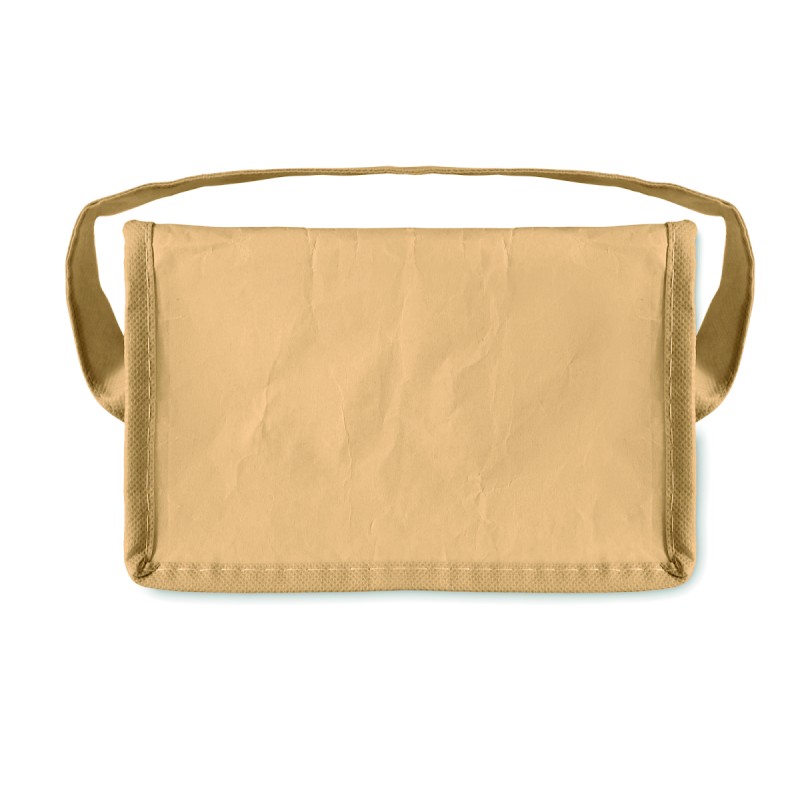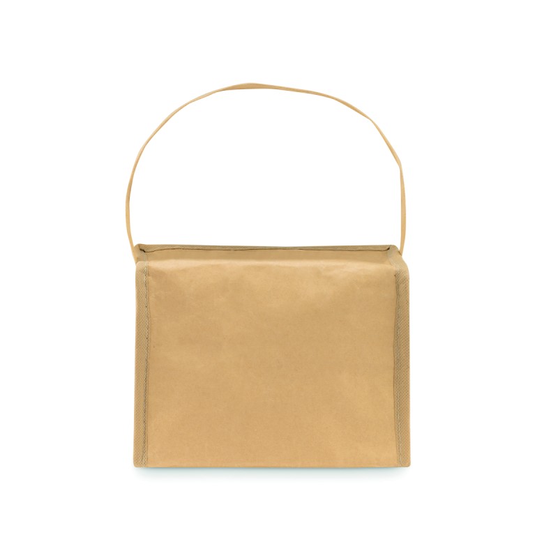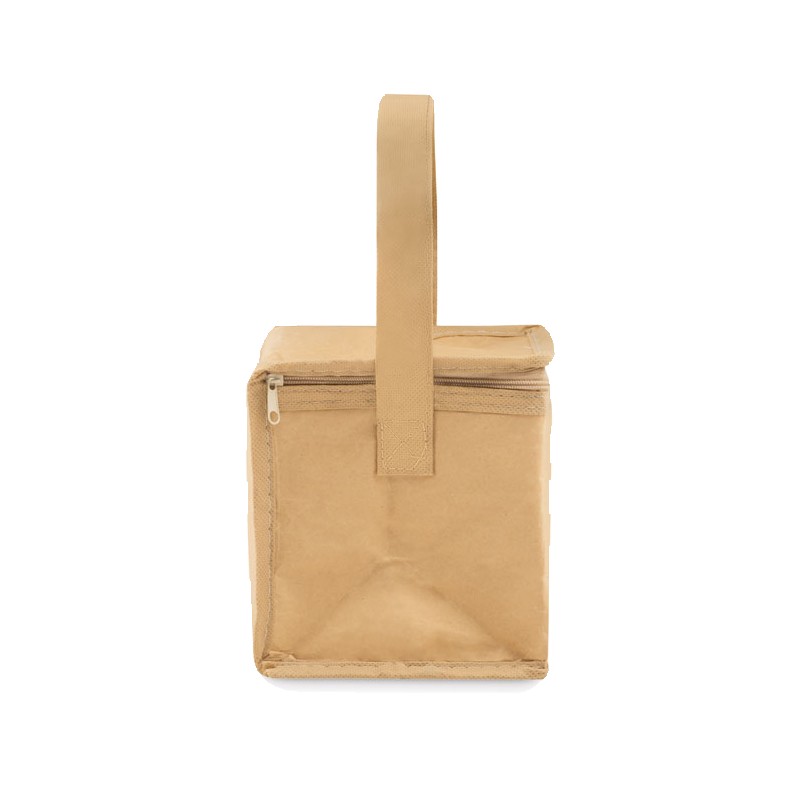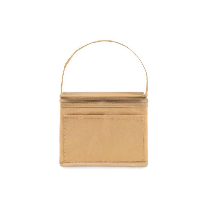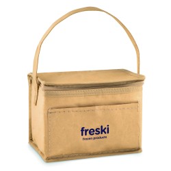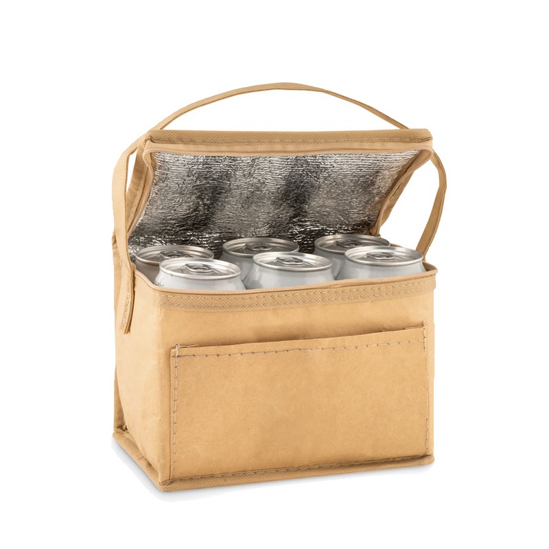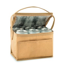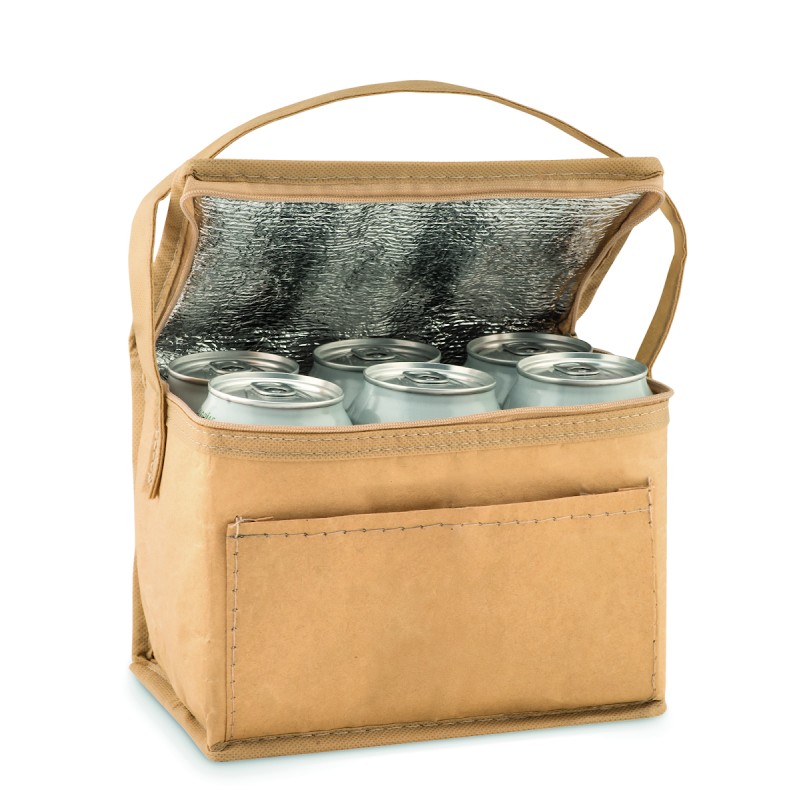 Sac isotherme en papier recyclé pour 6 canettes. Comprend une anse et une poche avant. Matériel d'isolation: Couche de mousse PE. Contenance 3L.