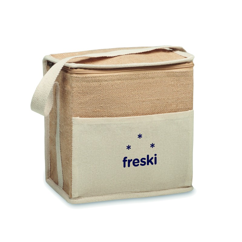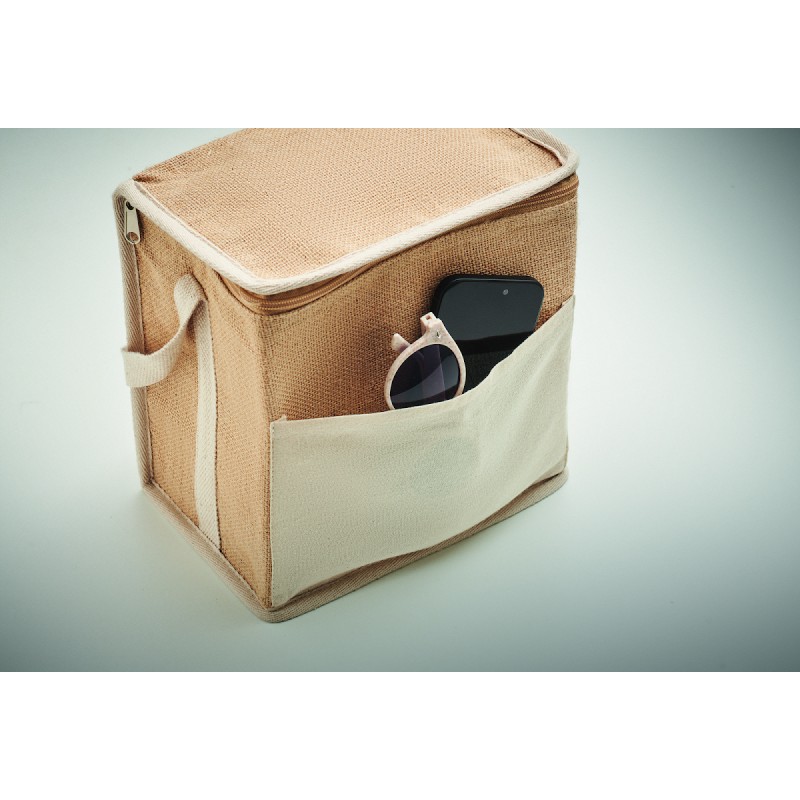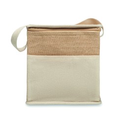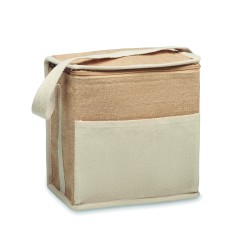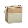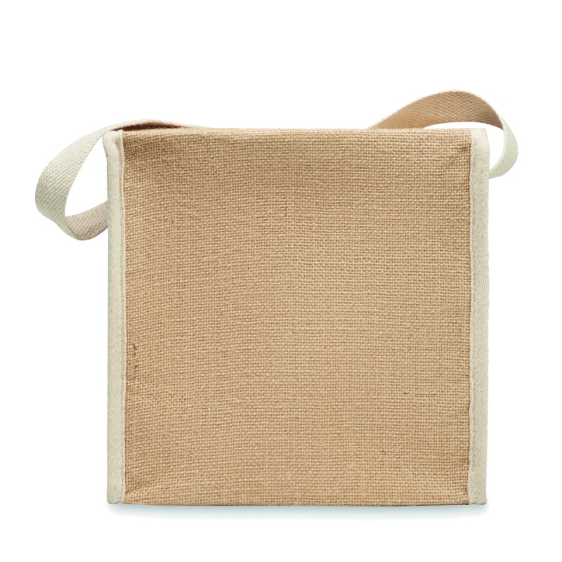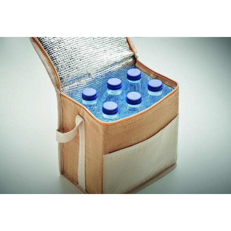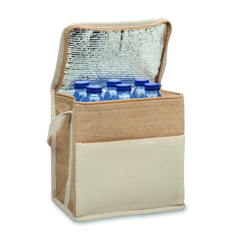 Sac isotherme en jute avec sangle en coton et poche frontale. Peut contenir 6 bouteilles de 0,5 L. Matériau d'isolation : feuille d'aluminium de 3 mm. Capacité de 3 litres.